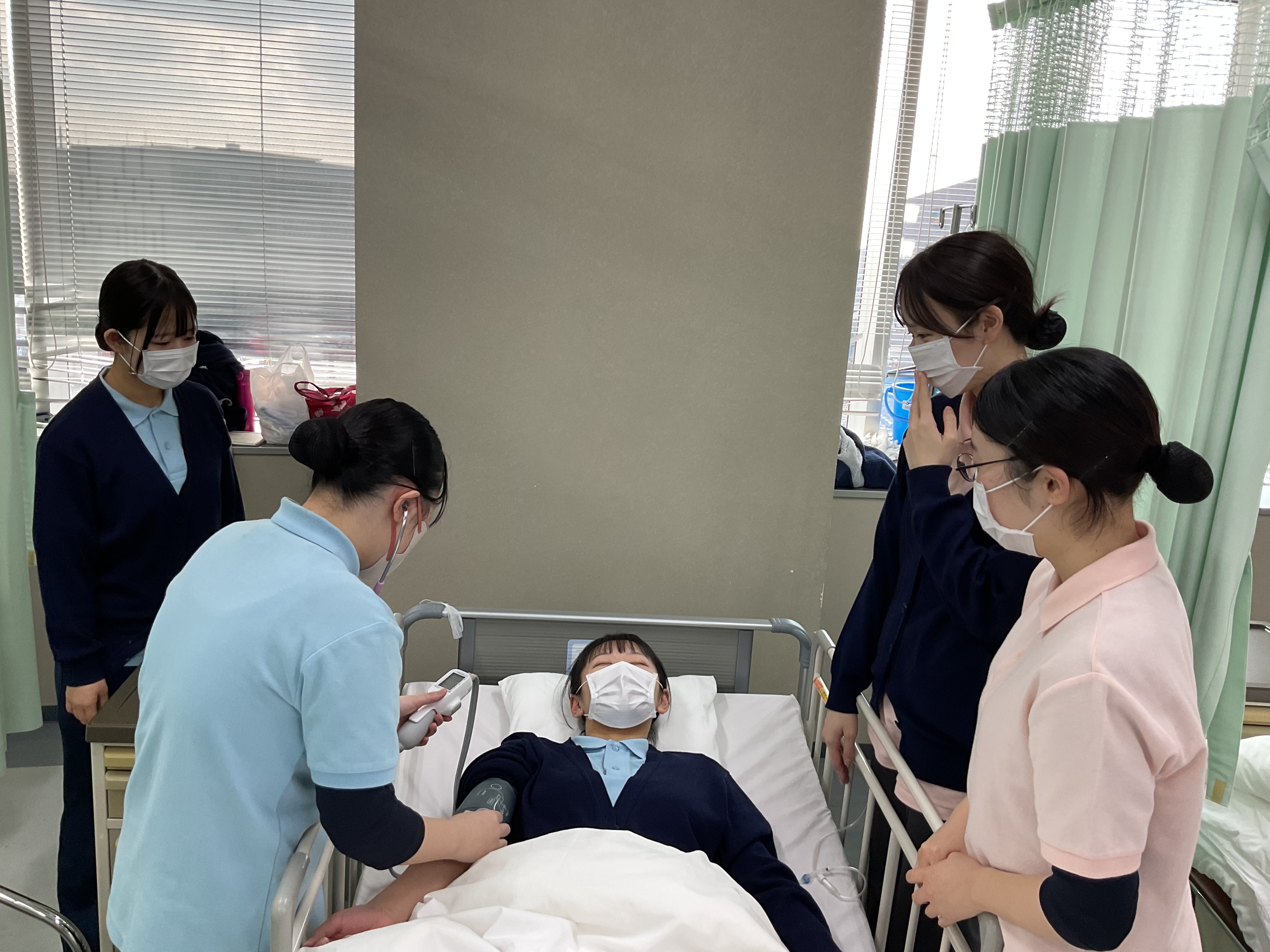 1年生は、バイタルサインの測定の技術試験にむけて、自主トレーニングをしています。